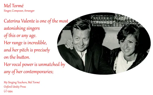 By 1952 Caterina had left the Family act, got married and toured the USO Clubs in Europe and North Africa with her Juggler/Drummer husband – Gerd Scholz 1951-1971 (manager). Second husband was pianist Roy Budd. In 1953 Caterina reluctantly agreed to perform as a Singer/Dancer in the Circus Grock’s Swiss Tour. The show was a hit and she was to do a recording session at Rdio Zurich. Her husband sent the tapes to all the major Radio Stations in Germany which got Caterina an audition at the Radio in Baden Baden for Jazz Band Leader Kurt Edelhagen , who after the audition claimed- he had found the most musical woman in the world.